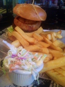 There are the usual English pub fare choices (fish and chips, burgers and sliders, tikka masala, shephards pie, scotch eggs, bangers and mash). Staying true to so cal diets, the menu has a vegetarian section, and the burger in this blog post is actually a vege burger. Prices are affordable at $10 to $15 per entree and they are usually offering some kind of beer special.